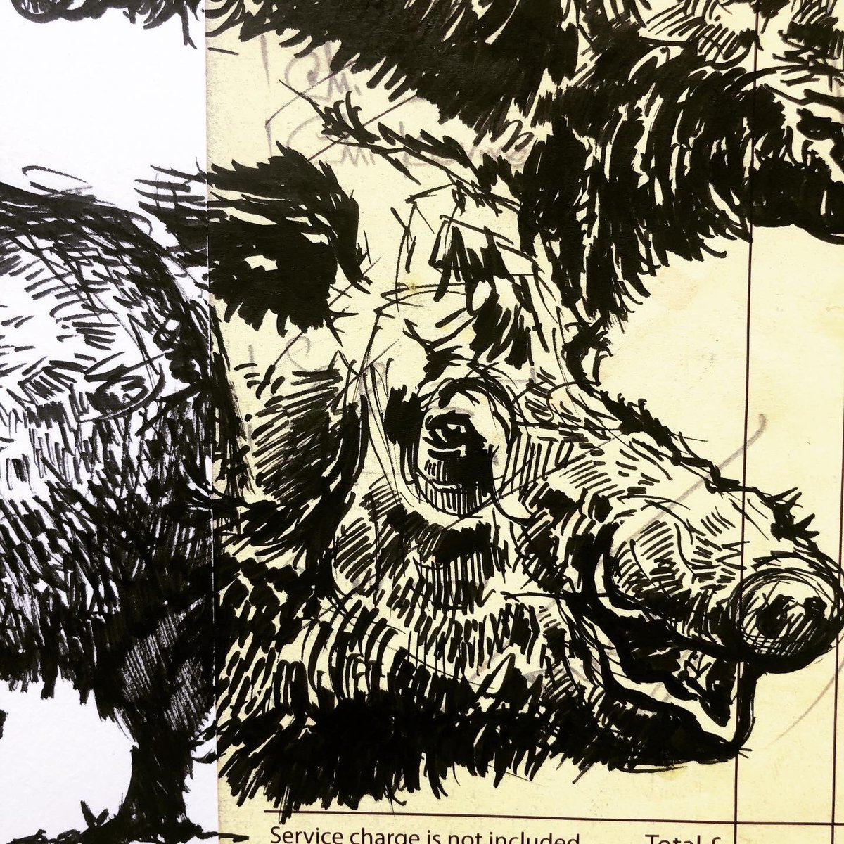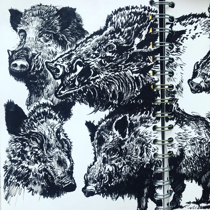 Boar - still drawing wild boar as we go into the weekend. Ink brush pens sketchbook and Friday night curry receipt. Bees and studio sorting this morning but apparently I have to go and get coco pops first. #inkpens #wildboar #boar #pig #draw #inktober #inktober2020 #artteacher