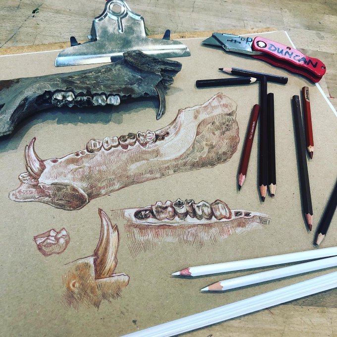 ✍️ Boar Jaw - Medieval specimen - retrieved & gifted to me - from the Thames foreshore by lockdown online Instagram freind @MarkSowden3 - so here I am, drawing in colouring pencils on a very rainy Saturday - #draw #pencil #inktober2020 #boar #boarjaw #medieval #mudlarking #thames