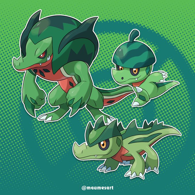 Meet Crocomel (Grass), Melligatr (Grass) and Wacranaw (Grass/Dragon), the starter Pokémon line inspired by crocodiles and watermelons. Made by me for @/kitanoregion on IG. #starterpokemon #bulbasaur #pokemonday #fakemon #pokemon #anipoke #pokemonscarletviolet #nintendo