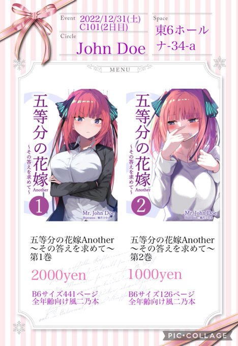 【宣伝】 (`・ω・´) #C101 で頒布致しました 「五等分の花嫁Another~その答えを求めて~」シリーズ 第1巻 および第2巻 メロンブックスで絶賛通信販売中です! よろしくお願い致します! 【第1巻】 bit.ly/3GCY3UK 【第2巻】 bit.ly/3XjoGVd #C101告知 #C101新刊 #風二乃 #風二