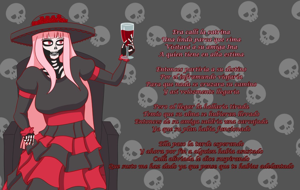 Hace unos dias me entere que la catrina es una parca borracha, lo cual me recordo a cierta otra parca que disfruta de los licores así que decidí hacer este dibujo acompañado de esta calaverita #callillust #catrina #hololiveEnglish