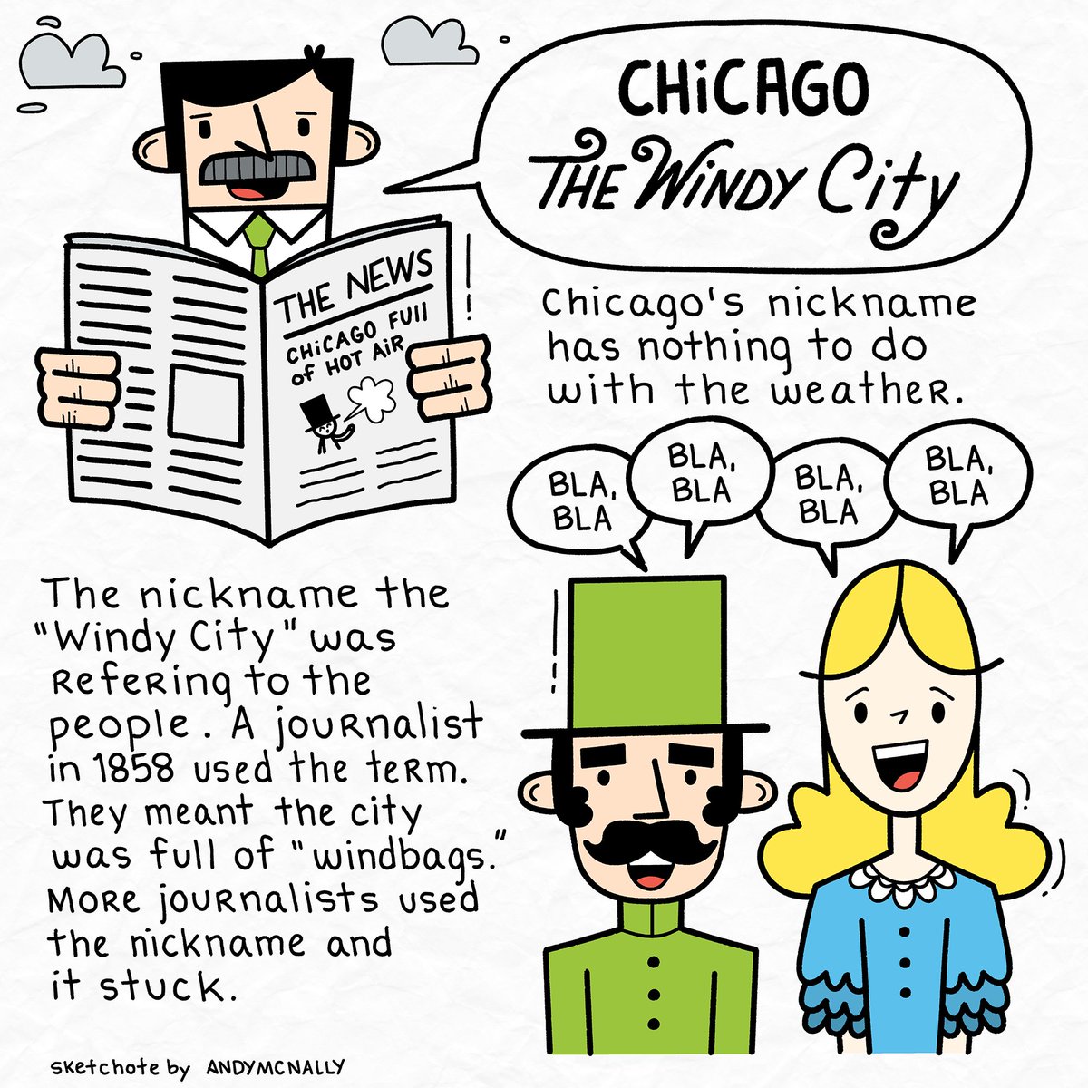 The Windy City. Chicago. The Windy City’s nickname has nothing to do with the weather. #sketchnotes #illustration #conceptsapp #nicknames #thewindycity #Chicago