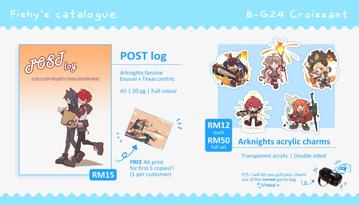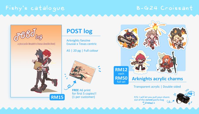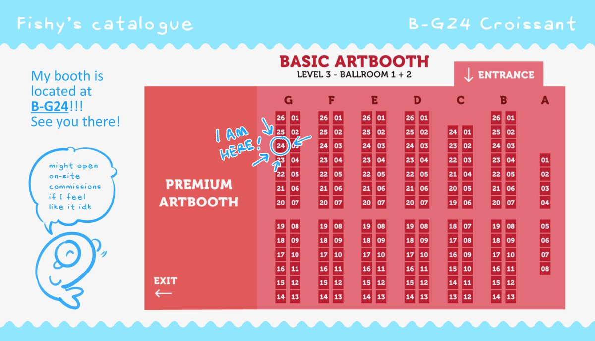 Good morning! Took me a while, but here is my catalogue for #comicfiesta2022 !! I will be at B-G24 (Level 3 Ballroom), the booth name is Croissant! I have some Arknights and Splatoon merch if anyone is interested Hope to have fun at the event! 🐟🐟🕺🏻