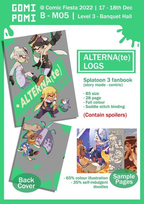 There's only a week left till Comic Fiesta so it's time to announce my catalogue. I will be having a booth in #comicfiesta2022 along with some friends. Do drop by if you're interested in my splat stuff! :)