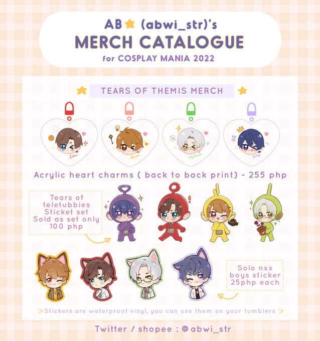 Here's my merch catalogue ~ I'll be at Cosplay Mania 2022 together with several artists!!✨ Our booth location is at L28 After Thursdays✨ Feel free to visit us ٩(◦`꒳´◦)۶💕 See you there!✨ #CosplayMania2022