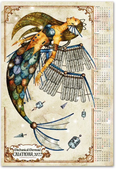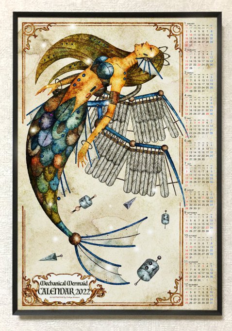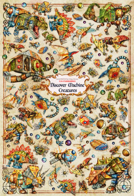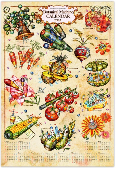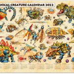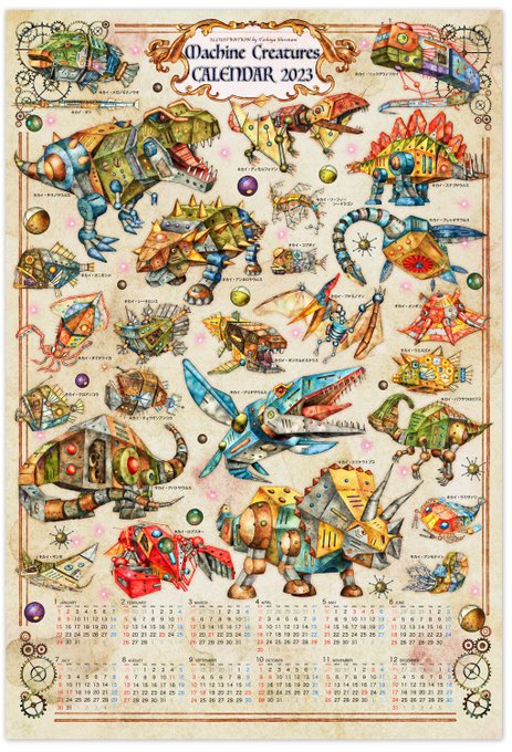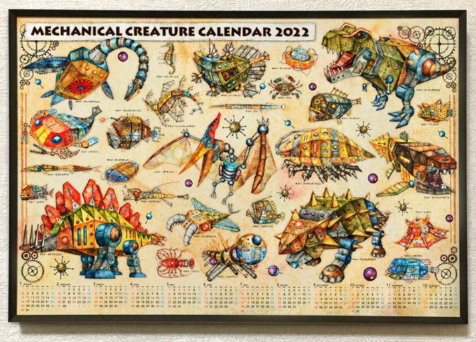 『2022年機械生命体ポスターカレンダー』 恐竜や古代生物から深海魚まで、個性的な生き物たちを機械化した図鑑ポスターカレンダー。 通常のおまけシール2枚に加え、今なら大判ステッカー付き! #creema #イラストカレンダー