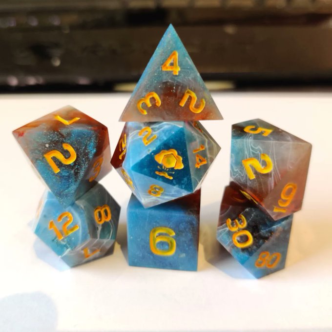 Respect the Alpha. Made this set based on Chetney, a character in @CriticalRole played by @WillingBlam ! Very happy with how it came out! #critter #criticalrolefanart #CriticalRole #ttrpg #handmadedice #DnD #artisan