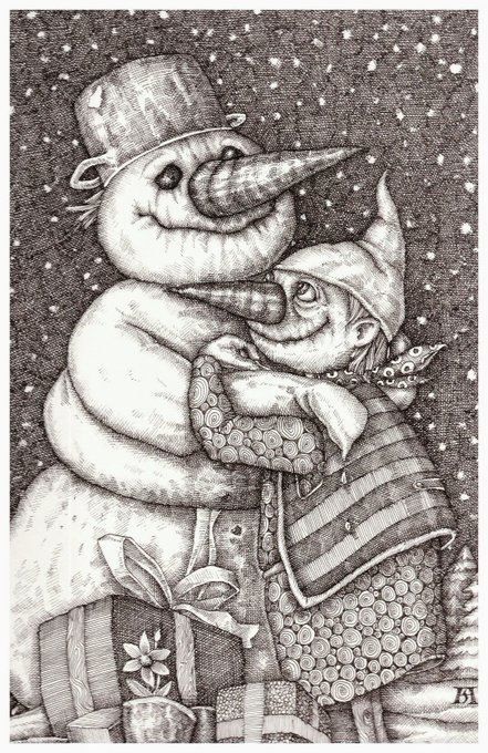 And you will also get a gift... Et vous recevrez également un cadeau... #drawing #dessin #illustration #December #SnowMan #gifts #inkdrawing #art #ArtistOnTwitter