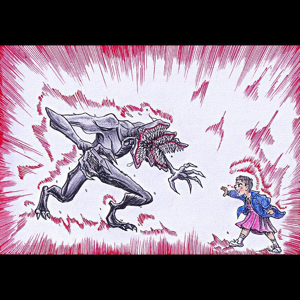 Eleven collides with Demogorgon ~ Stranger Things S1 INKTOBER 2021 Day 17 - COLLISION #Inktober #inktober2021day17 #StrangerThings #fanart #inktober2021collide #netflix #demogorgon #Eleven #inktober2021