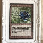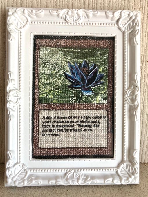 新作MTG刺しゅう出来ました♬ 世界中で多分1番有名なマジックの カード「ブラックロータス」 本物と並べる事は出来ませんが… 写真L版サイズなので細かい部分は 表現出来てないけどなんとなくは 読めるみたいです(´∪︎`*) 旧枠感は出せたかな〜 #mtgfanart #embroidery