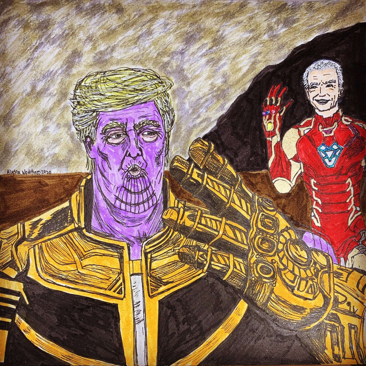 Inktober 52 Weekly Challenge. Prompt: “Gauntlet” #inktober #inktober52 #inktober52gauntlet #thanos #ironman #trump #biden #endgame #infinitystones #ink #art #drawing #sketch #edding #arteza #sakura #alyssasarttherapy #resistthroughart