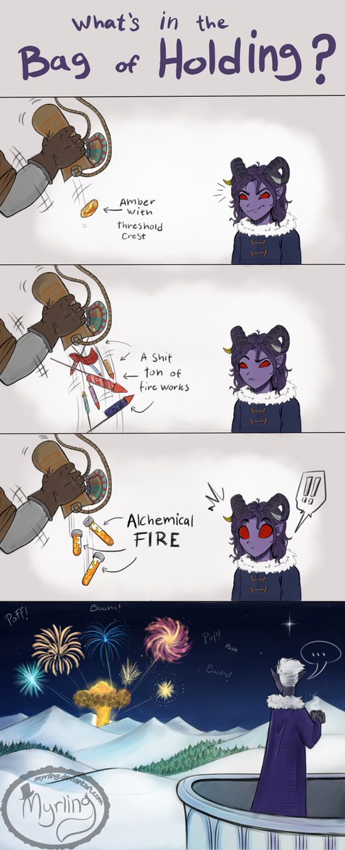 *CLICK FOR FULL SIZE* Campaign 2 episode 123/124 Just a smoll comic about my musings on one of the biggest questions in the #CriticalRole community: "What was in The Bag of Holding??" #CriticalRoleSpoilers #criticalrolefanart #fnart #EssekCanHaveACupOfCocoa #AsATreat