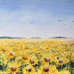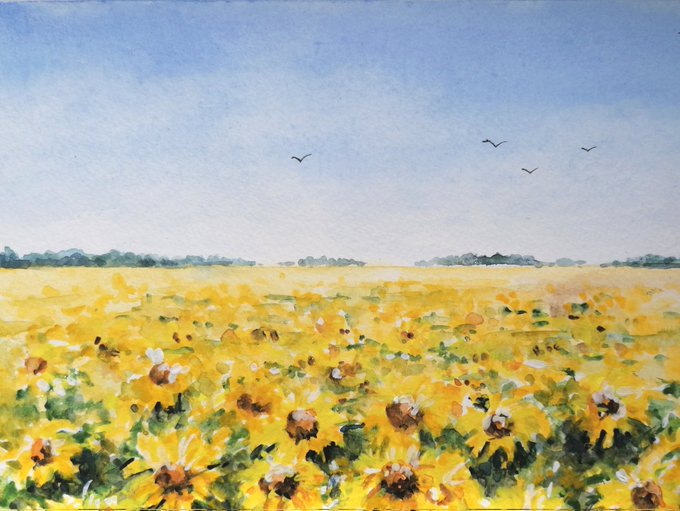 Tranquil landscape above the sunflower field. #Peace #art #watercolorart #landscapepainting #friendship