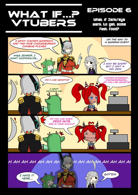 New "What if? Vtubers" is done! I had this idea after @Vomaas_Vtuber turned Ironmouse into a Wendy's employee...before Zen/Haruka/Geega did a similar skit on stream last week... Also, good luck at the Gundam Evolution tournament Zen! #zentreart #HarukArt #GEEGArt #ironmouseart