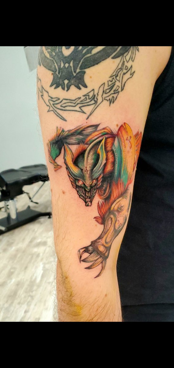 @godeaterden Hannibal! Nice start and I'll be revisiting this one with additional highlights and background once more Aragami are added down my client's arm! #art #Tattoo #videogame #GodEater #inktober2022