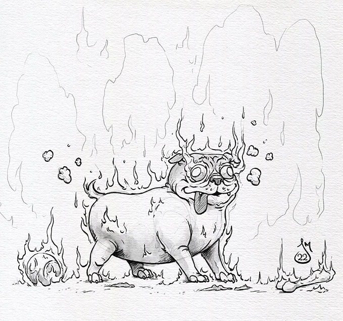The sketch of this little guy popped up recently... so I thought inking him would be a perfect fit for this morning's #Inktober prompt, "Flame". #DailyDoodle #Inktober2022 #HellHound #HellPug #Pug