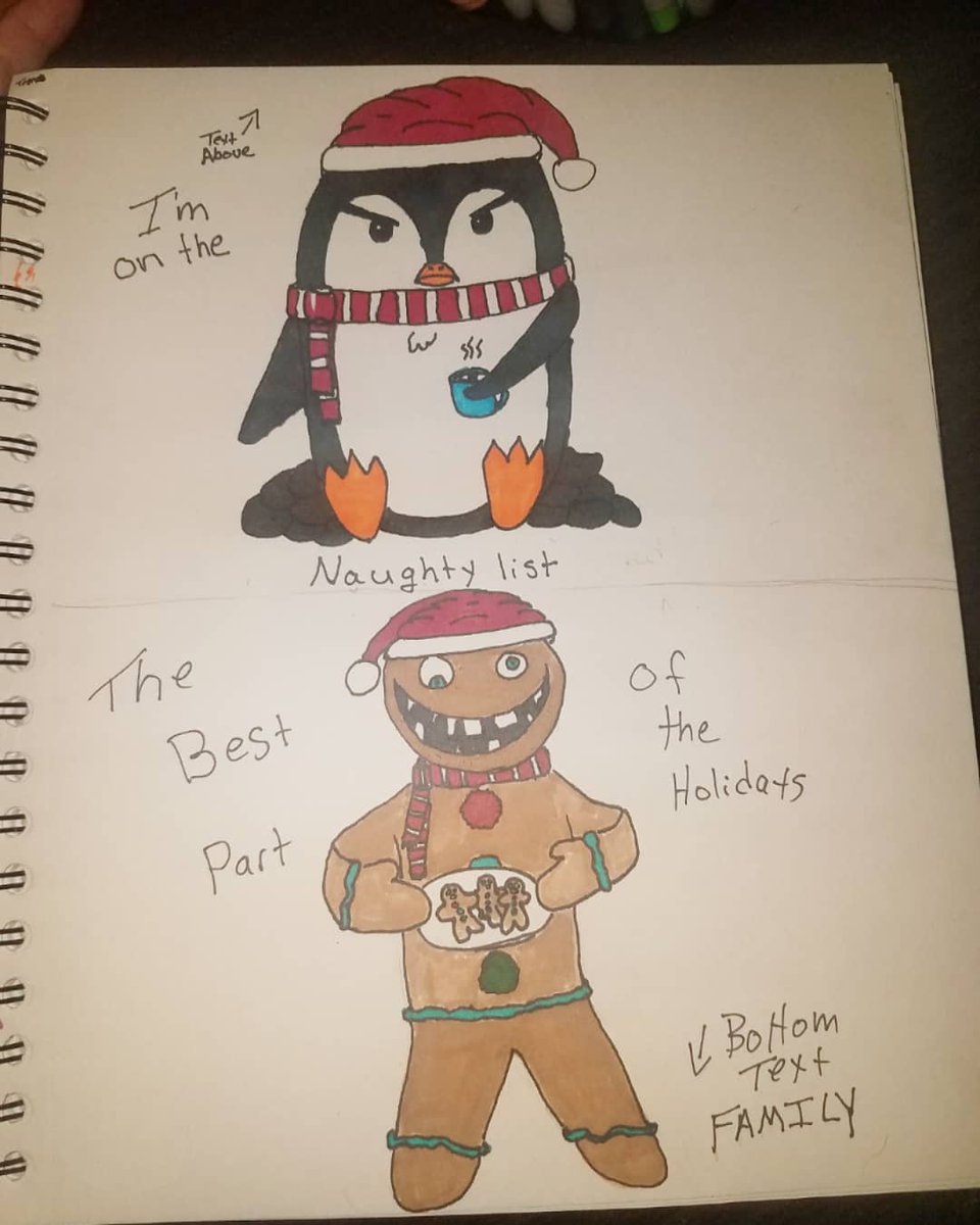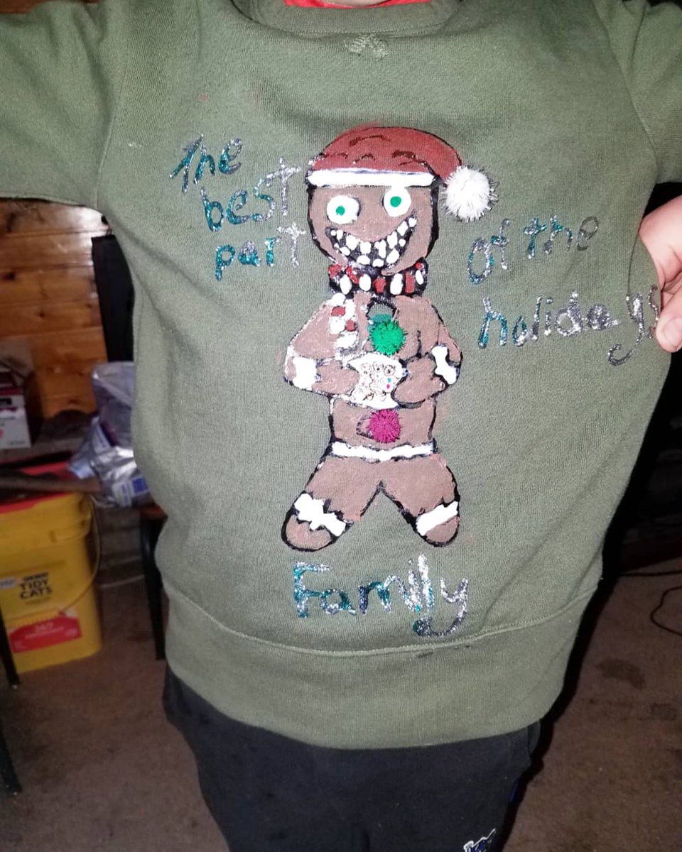 My kids had an ugly Christmas sweater day, at school and we decided to make them They choose the designs, and helped me put them on the sweaters. #art #drawing #christmas #inktober #arttober #penguin #gingerbreadman #funny #creepy #cute #uglychristmassweater #homemade