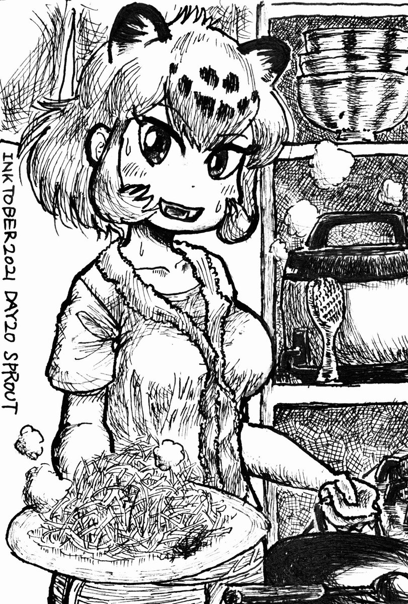 #inktober2020 #inktober #けものフレンズ DAY20 SPROUT ジャガーさんか作ってくれるもやし炒めはさあ…なんていうかこう…甘い味がするんだよね… 「フフッ砂糖は入れてないよ」 …聖獣!! ごはん何杯でもいけちゃう!!
