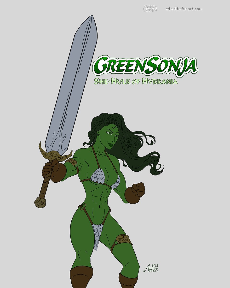 Imagine Red Sonja with super strength, impervious to swords, arrows... and towering at 6'7" green skinned? My own take on Sonjaversal, mashup with She Hulk!💚💚 @DynamiteComics @Marvel #redsonja #greensonja #hyrkania #shehulk #jenniferwalters #mashup #fanart #whatthefanart