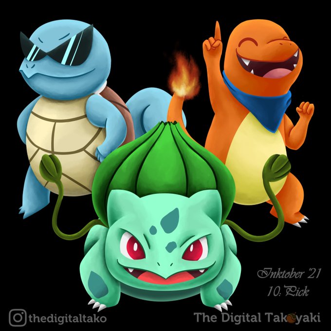 Inktober 10: Pick You can have one! Choose! おまえに1匹やろう!さあ、えらべ! #Inktober #inktober2021 #illustrations #digitalart #イラスト #アート #Ilustración #artedigital #イラスト好きな人と繋がりたい #squirtle #charmander #bulbasaur #pokemon #cute #kawaii #starterpokemon