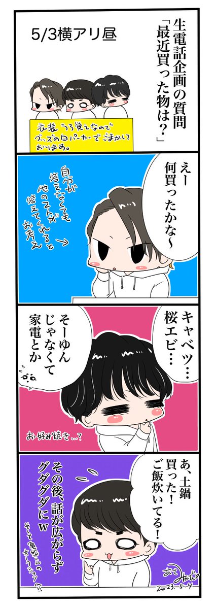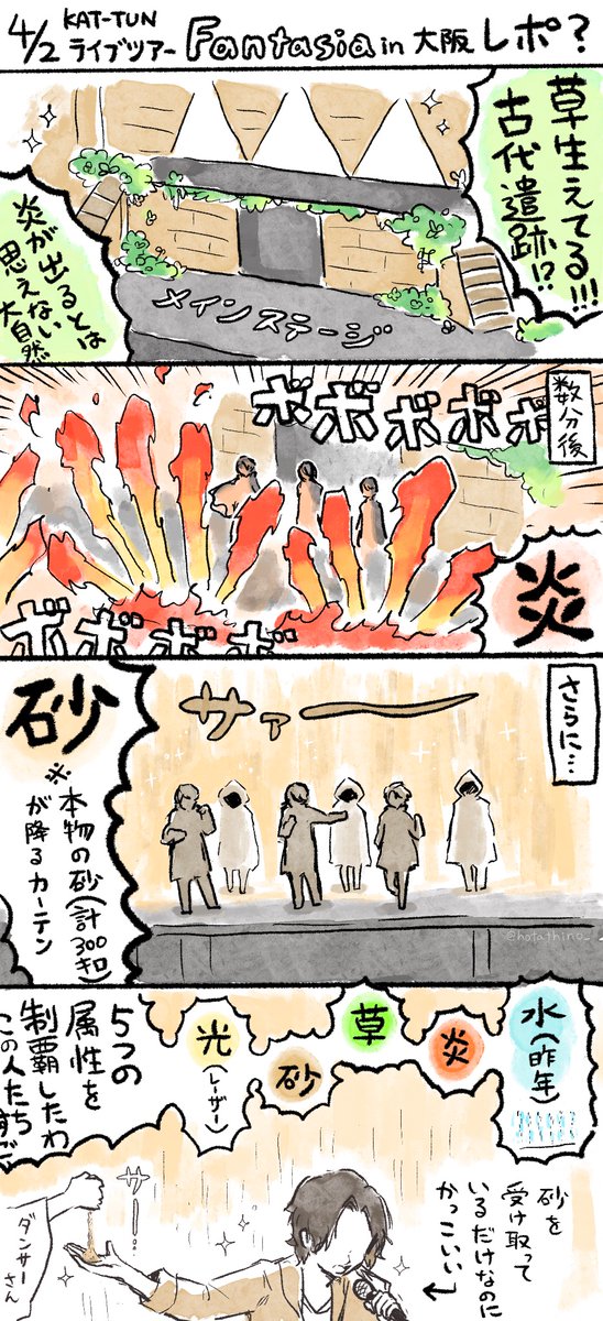 5月3日横アリ昼公演の落書きレポ4コマ 記憶力自信梨なのでニュアンスだけでも伝われ〜 #KATTUNLIVETOUR2023Fantasia #KATTUN_Fantasia 残りの公演も楽しいライブになりますように✨ 推したちに誇ってもらえるように参戦マナーを守って乙女筋フル稼働させましょうぜ🔥