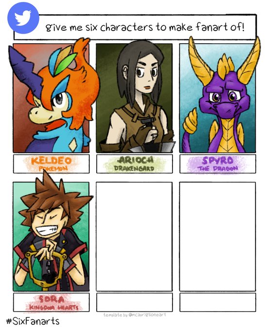 #SIXFANARTS Challenge! Twitter version! Two slots are still available! Thanks to those who took part - @KawaiiKing64 with #Keldeo from #pokemon, @MrReddragon543x with #Arioch, @SomosNueces with #Spyro and @Baghdig with #Sora from #kingdomhearts !