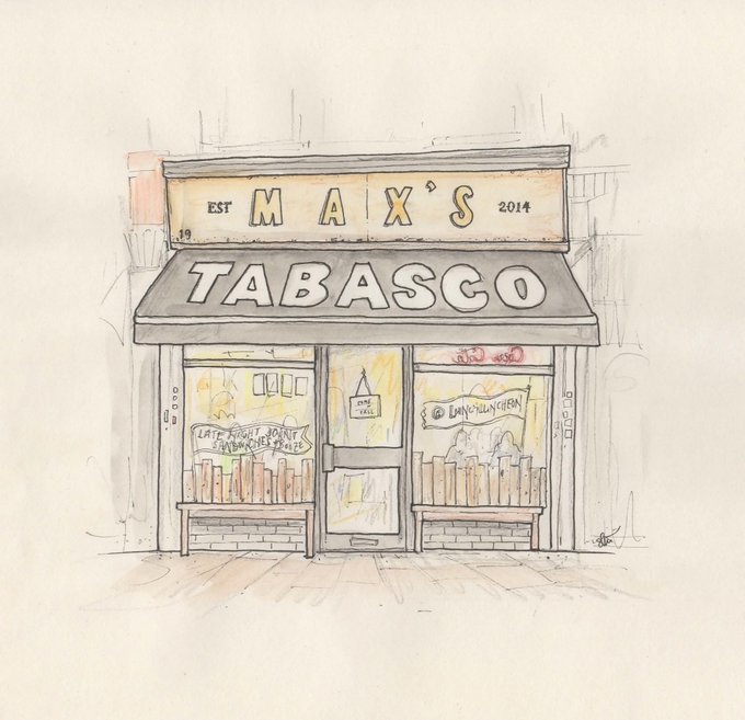 Ink, watercolour and coloured pencil on bamboo paper of Max's Sandwich Shop in #Stroudgreen #CrouchHill #art #HandmadeHour #inktober #sandwichshop #maxssandwichshop #drawing #london