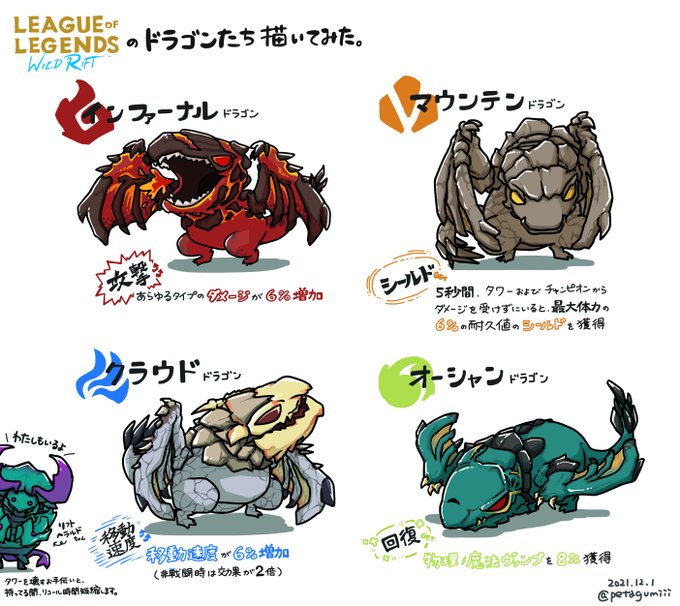 一生ドラゴンのバフを覚えられなかったので、勉強がてらワイルドリフトのドラゴンたち描いてみました!!(エルダーは描いてません!) #ArtofLegends #ワイルドリフト #LeagueofLegendsWildRift