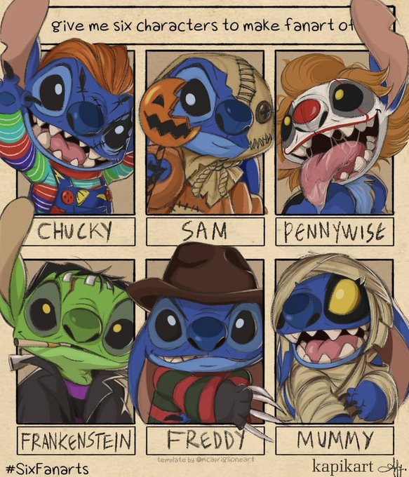 My take on #sixfanarts . I did the Pennywise one previously, so I thought I was just gonna go with a horror theme. #sixfanartschallenge #kapikart #disney #liloandstitch #horrormovies #characterdesign #fanart #themummy #freddykrueger #frankenstein #pennywise #chucky #digitalart