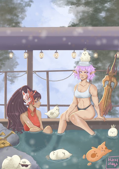 My hunters enjoying a hot spring with friends✨🌸 can you guess what hunter uses what weapon? 😘 #MonsterHunter #MonsterHunterRiseSunbreak #MonsterHunterWorld #art #artistsontwitter
