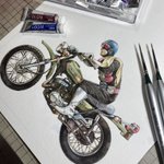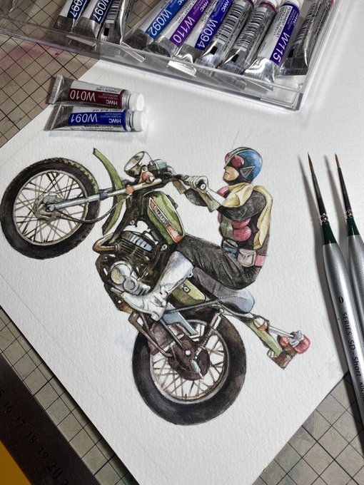毎日暑いですね🥵子供とずっとプールに浸かってました😅手前のライダーはこれくらいで、後ろに何を描くか考え中です。 #仮面ライダー #kamenrider #maskedrider #透明水彩 #watercolor #drawing #draw #仮面ライダーブラックサン #バイク #automobile #デッサン #blucksun #イラスト #illustratio