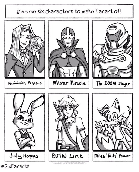 I had fun drawing these! Thanks everyone who gave me the suggestions! #SixFanarts #MaximillionPegasus #MisterMiracle #DOOM #JudyHopps #BOTW #Link #Tailsthefox