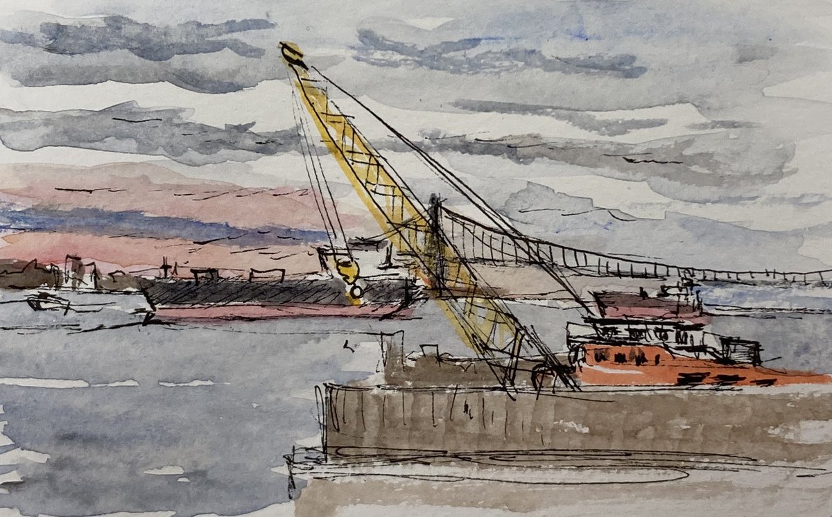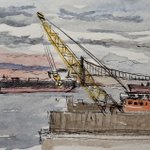 Yellow crane at the Staten Island ferry terminal, St. George. #art #ink #watercolor #ship #verrazzanobridge #ferry #statenisland #nyharbor #morning