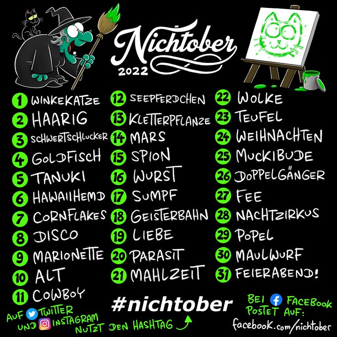 Auch dieses Jahr veranstalte ich wieder meine kleine Kunst-Challenge namens #NICHTOBER. Jeden Tag im Oktober gibt's einen Begriff, zu dem alle etwas zeichnen, malen oder basteln können. Bis Oktober sind's noch ein paar Tage hin, aber für Neugierige hier schon mal die Liste: