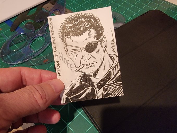 #Inktober #InktoberEs #Inktober2021 #inktober2021day29 #Patch #NickFury #Avengers #MCU #Marvel @InktoberES No es lo que tenía en mente, quería dibujar a los dos Nick Fury, comic y MCU, pero he tenido un día demasiado ajetreado y lo subo algo tarde y ni medio bien 😅