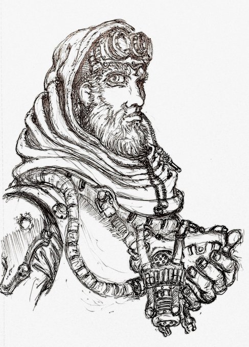 Managed a quick sketch between household tasks and sick people.😜#neonseedstudios #ballpointpensketch #pen #ink #inktober #roughsketch #characterart #nomad #steampunk #dieselpunk #raypunk #atompunk #art #artist #drawing #artistontwitter #artontwitter #artonpaper #dailydrawing