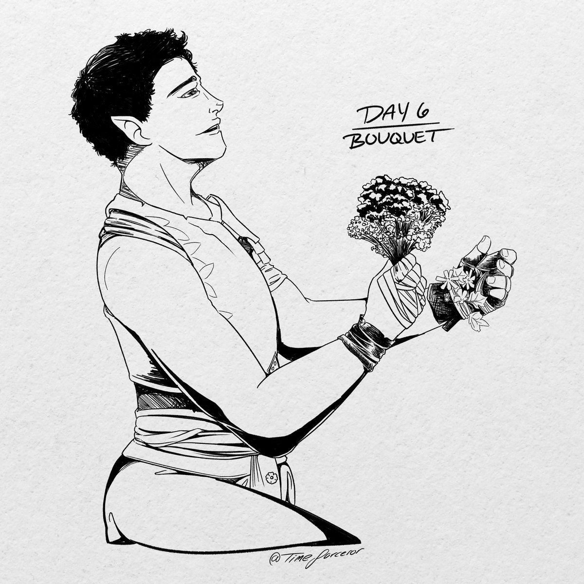 Inktober Day 6 – Bouquet 💐 Orym, in another place and time, handing a bouquet of flowers to his beloved Will. #inktober2022 #inktober #criticalrolefanart #orym #orymoftheairashari #criticalroleart #criticalrole