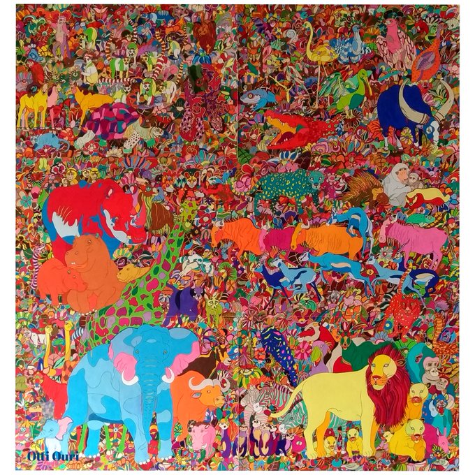 あらためましてOttiのアフリカ動物、無事完成しました🐒🌺タイトルは「African Voice」(114㎝×108㎝)です。いろいろなところにいろいろな動物たちを発見できる、楽しい作品です☺️ご覧いただけますと嬉しいです✨ #OttiOuri #art #artwork #ArtistOnTwitter #Artist #illustration #高校生