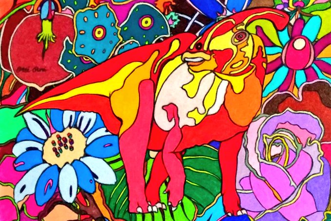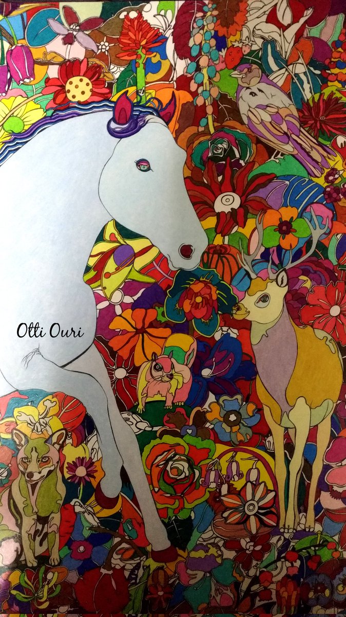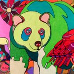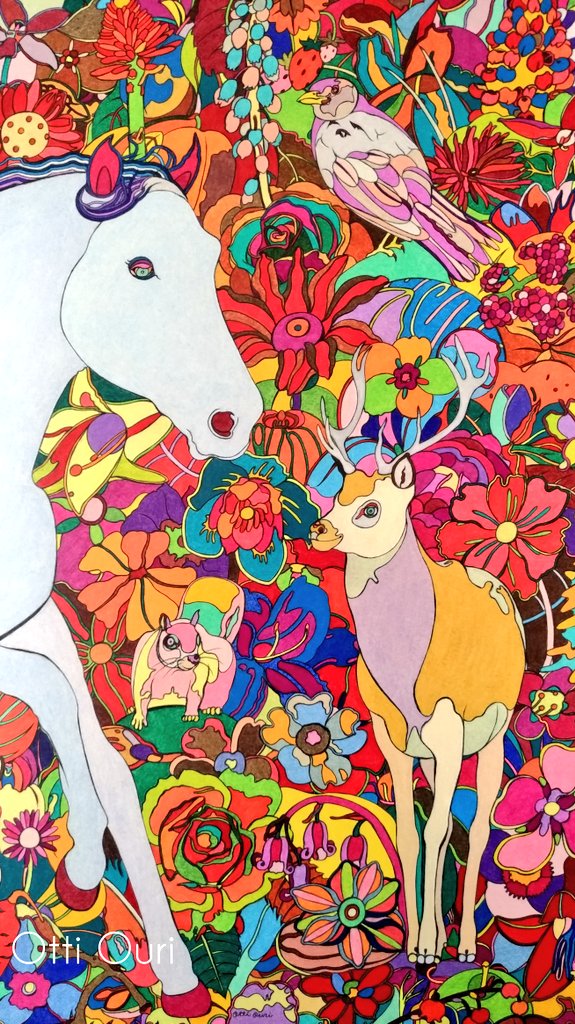先週動画投稿しましたOttiの新作です🐴🌼森(イギリスの森だそうです)を守る馬の神様と、森に生きる動物たちを描いてみたとのこと、平和で美しい世界を目指したそうです✨✨ #OttiOuri #高校生 #art #illust #popart #modernart #イラスト好きな人と繋がりたい