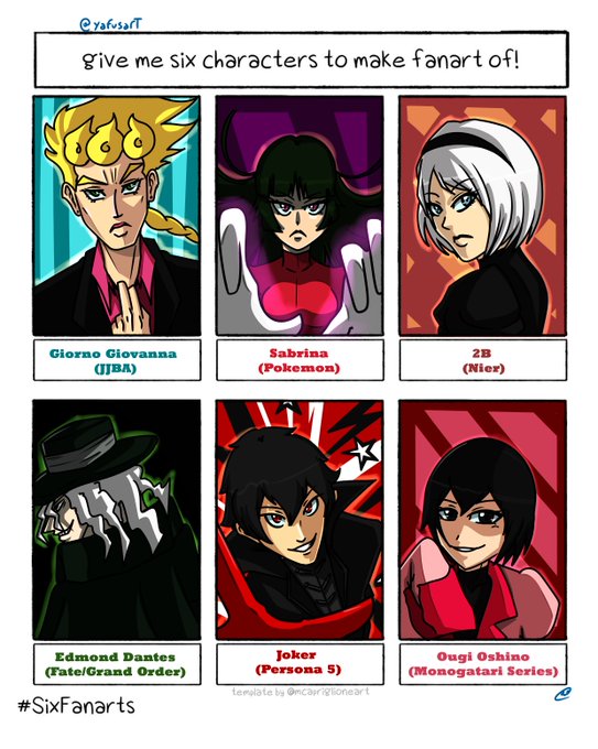 Made my second one and I still have some more to go. #sixfanarts #fanart #drawingchallenge #2B #sabrina #giornogiovanna #jjba #pokemon #edmonddantes #fgo #joker #persona5 #p5 #monogatari #ougioshino #yafusa #yafusart
