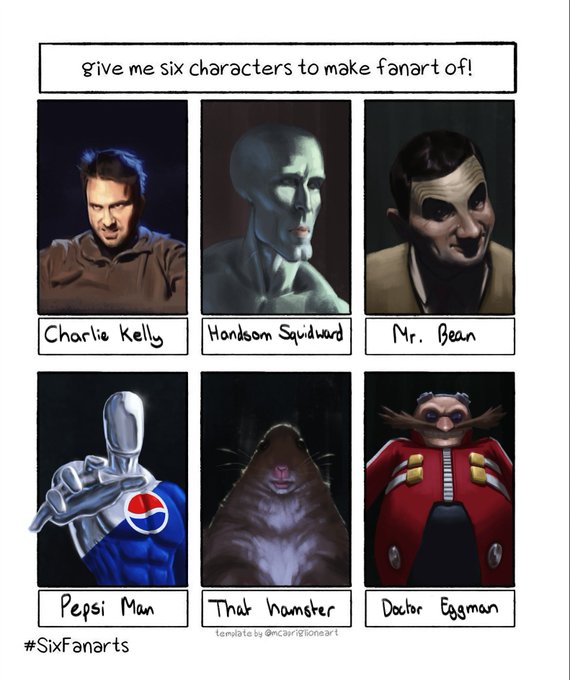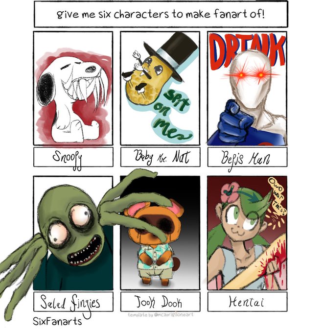 I take my job very seriously. This exercise reflects my followers and friend group more than anything I could say myself. Part two coming soon. #sixfanarts #sixfanartschallenge #saladfingers #animalcrossing #animalcrossingnewhorizons #tomnook #charliebrown #pepsiman #memes