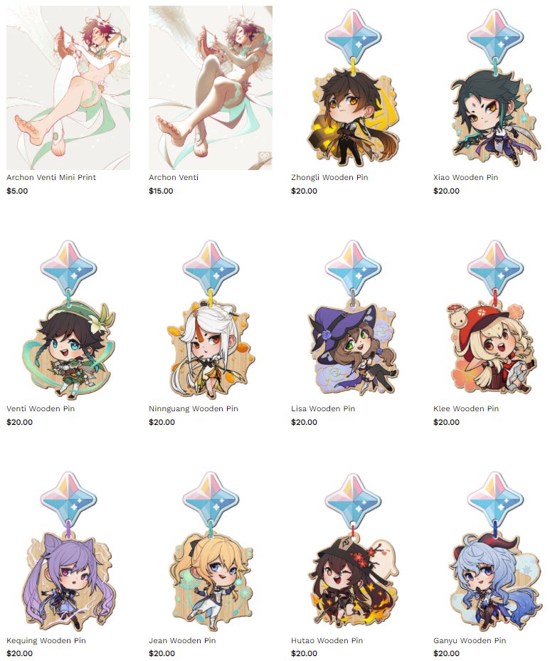 Genshin Wooden Pins now available on my shop site along with some new prints! ♥ whispyshop.com #GenshinImapct #wooden #pins #venti #genshinimpactfanart