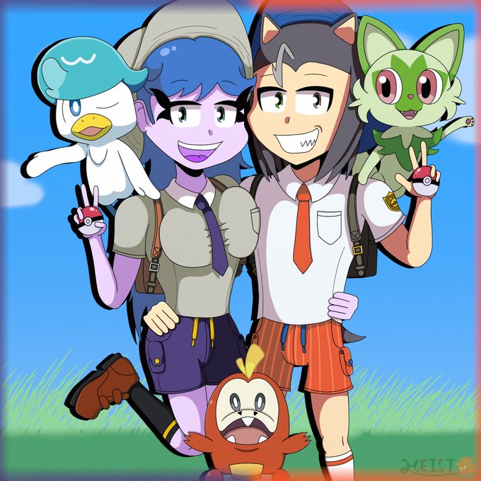 [#PridefulDiamonds Art/Falvia is owned by @SonicStarGenie] Heist and Falvia both went on vacation to the Paldea region and embark on an adventure!🧡💖💜 #ocart #digitalart #ArtistOnTwitter #PokemonViolet #PokemonScarlet