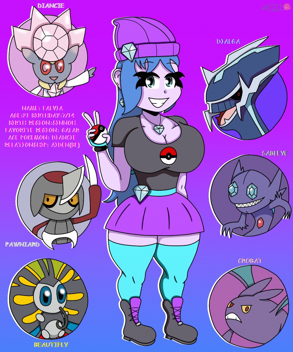 [#OC Art/ #Fanart] @SonicStarGenie, hope you don't mind but I made a reference sheet and #PridefulDiamonds art of your crystal girl Falvia as a Pokemon Trainer! 💎💜 #ArtistOnTwitter #digitalart #Pokemon