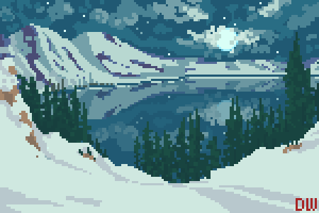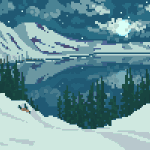 I drew this earlier today because I wanted to make a study piece- 🏔️ Nothing fabulous. #pixel #pixelart #ドット絵 #aseprite #landscape #environment #mountains #snow #lake #moon #reflection