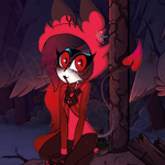 aqui rose tiernamente sentada en el bosque usando su pijama del traje de Alastor. #HazbinHotel #alastor #HazbinHotelFanart #Radiodemon #halloweenweek #inktober2021 #Inktober #hazbinhotelera #costume #HazbinHotel #succubus