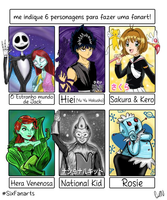 Mais um #SixFanarts pronto, as artes foram sugeridas pelos amigos no facebook e instagram. Demorei,porém gostei bastante de fazer essa parte 2. #jackskellington #hiei #sakura #sakuracardcaptors #kero #heravenenosa #nationalkid #rosie #jetsons #fanart #desenho #anime #tokusatsu