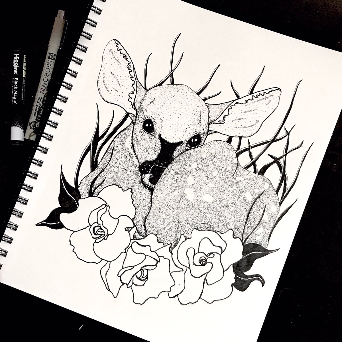#Rosie #Deer, I kind of love her, although I can already see her in watercolor in my mind, and she’ll be so much softer and cuter! #illustration #drawing #sketch #sketchbook #ink #inkdrawing #inktober #cuteanimal #woodlandanimal #roses #adorable #stippling #sketchdaily #penandink