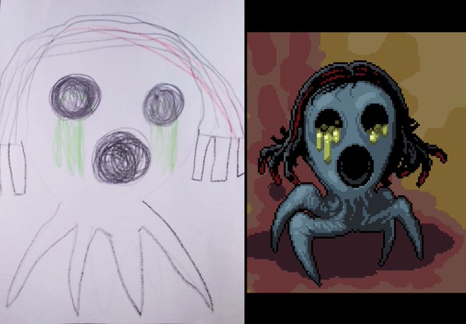 My daughter has drawn a monster for me to draw in pixel art. After reviewing it, she has given me the "go ahead" to include it in the next game. I think we should do it. 🤔 #survivalhorror #horrorgame #pixelart #indiegame #horror