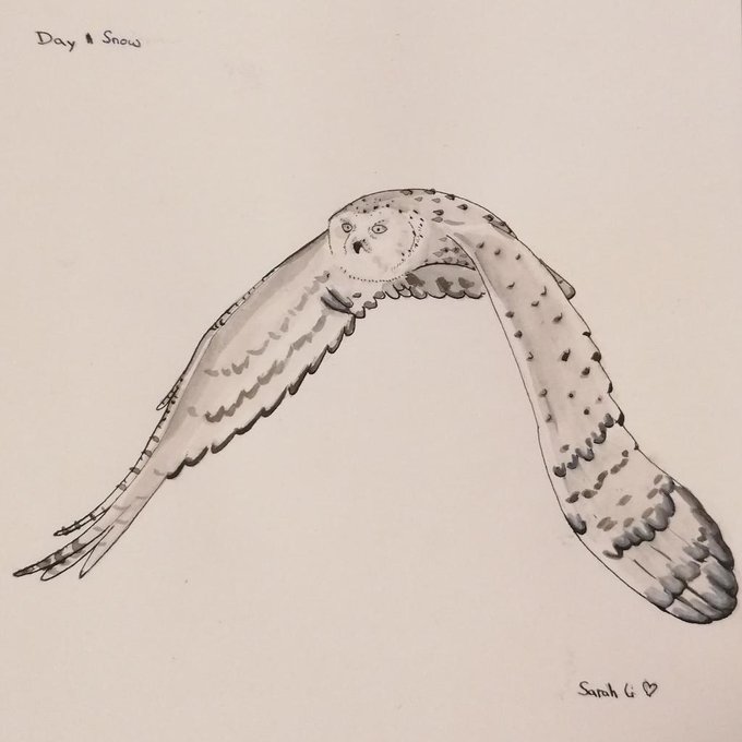 Inktober Day 11 Snow #traditionalart #inktober2019 #inktober #penandink #inktoberday11 #inktobersnow #snow #snowowl #owl #flyingowl